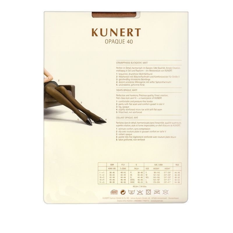 Непрозрачные, матовые, очень долговечные колготки KUNERT средней плотности (40 den). Для вашего удобства комфортная, недавящая резинка на поясе, штанишки с плоским швом, хлопковая ластовица, неусиленный мысок с мягким плоским швом, также не усиленная формованная пятка. СОСТАВ полиамид 94%, эластан 6% ПЛОТНОСТЬ 40 den ЦВЕТА бежевый, темно-серый, черный РАЗМЕРЫ 44-46, 46-48, 48-50, 50-52 Размеры соответствуют российским. ПРОИЗВОДСТВО KUNERT (ГЕРМАНИЯ)