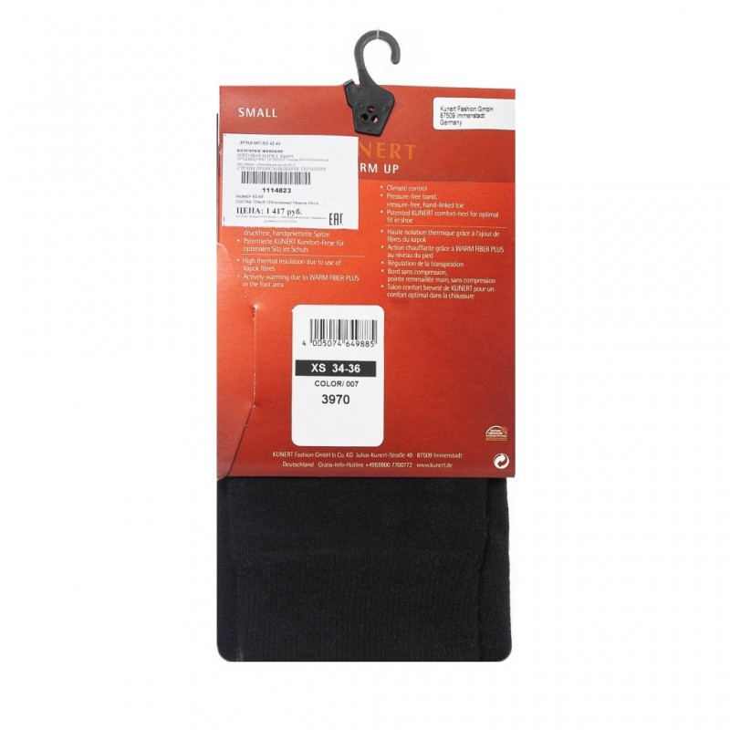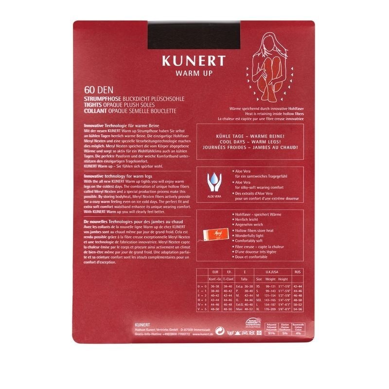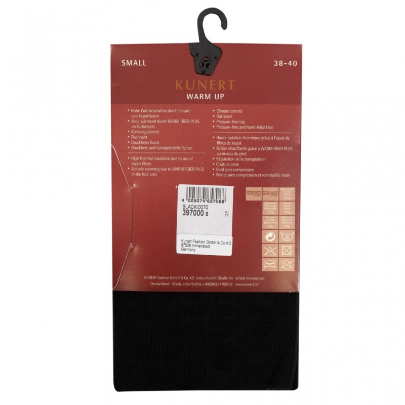 Колготки WARM UP от KUNERT с активной технологией утепления области стопы Warm Fiber Plus. Незаменимые в холодное время года, обладают высокой теплоизоляцией за счет использования волокна капок - растительной шерсти, добываемой из внутренностей плода баобаба. Имеют широкую комфортную резинку. Немецкое качество и комфорт. Состав 72% хлопок 13% полиамид 12% капок 1% полиакрил 2% эластан.