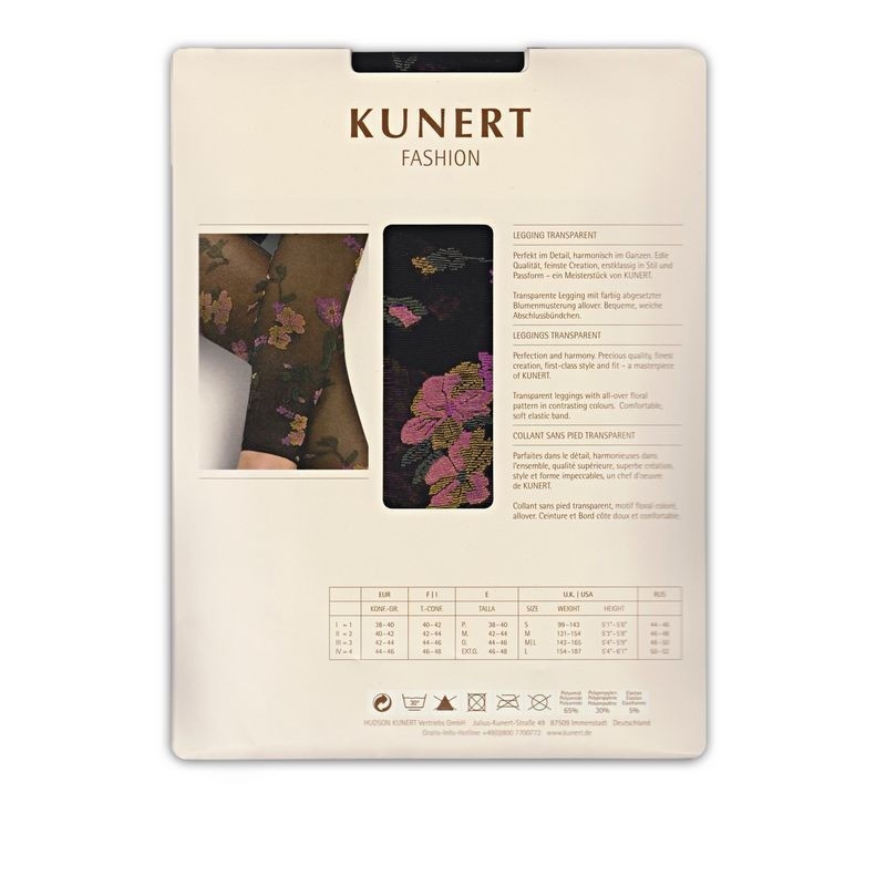 Прозрачные леггинсы, покрытые контрастным цветочным узором. Имеют удобный мягкий эластичный пояс. ЦВЕТ черный с цветами. РАЗМЕРЫ 44-46, 46-48, 48-50, 50-52. Размеры соответствуют российским. ПРОИЗВОДСТВО KUNERT (ГЕРМАНИЯ)